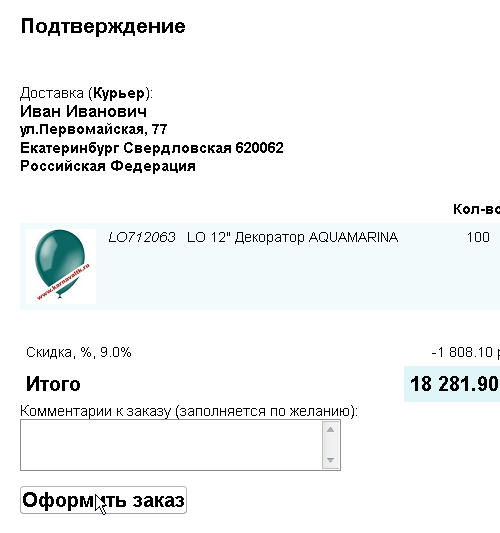 8. После того как Вы подтвердили заказ, информация о нем поступает на обработку к нашим менеджерам. Через некоторое время Вы получите по электронной почте Счет на оплату. Отгрузка заказа происходит, как правило, на следующий день после поступления денежных средств на наш расчетный счет.